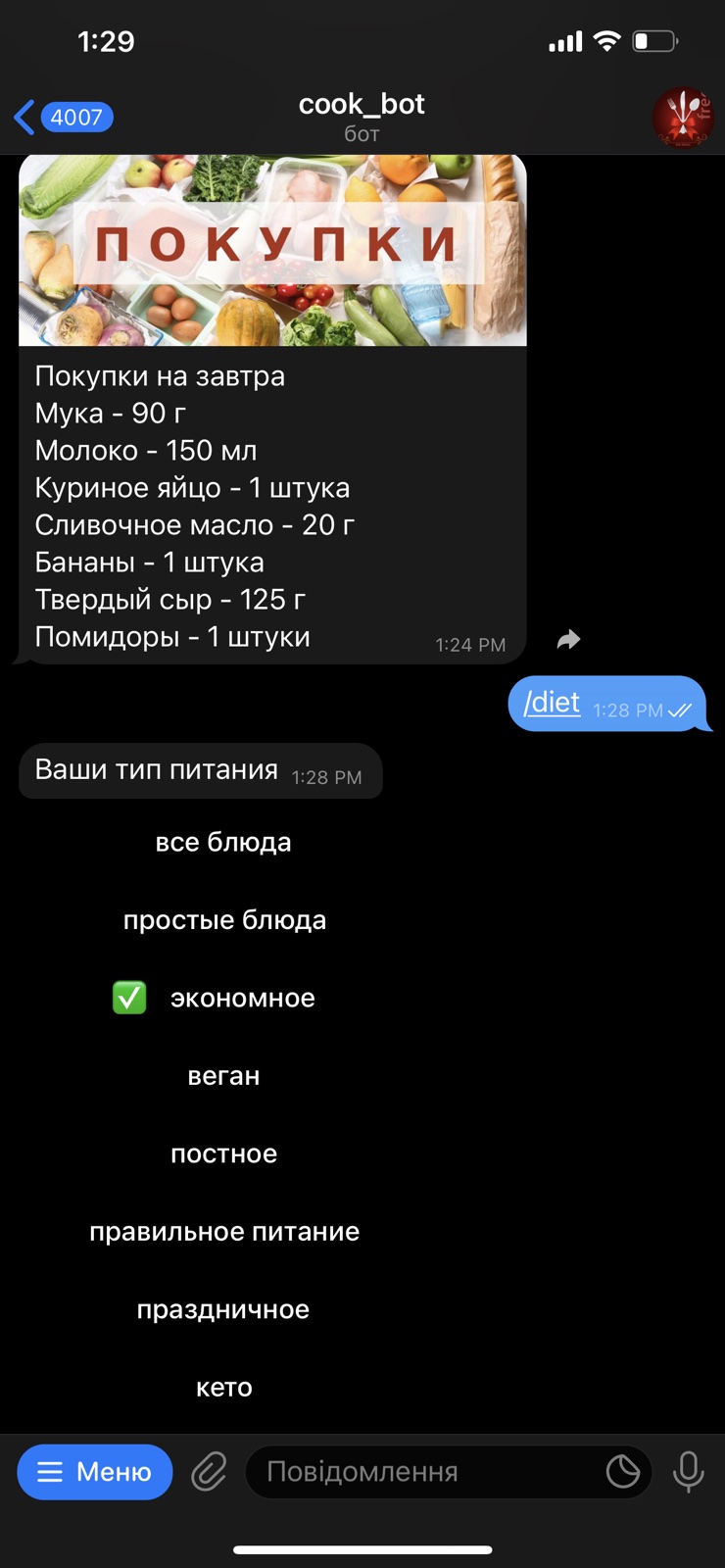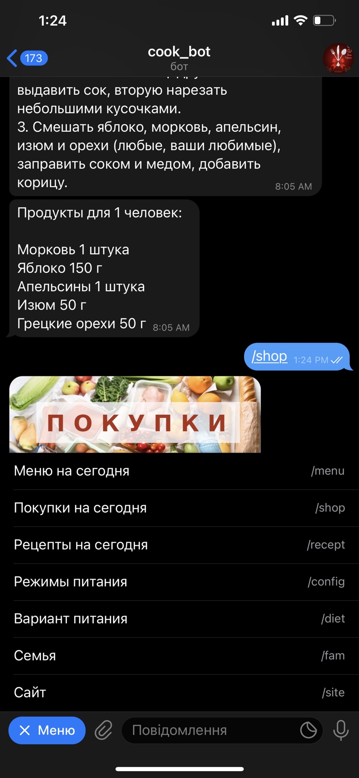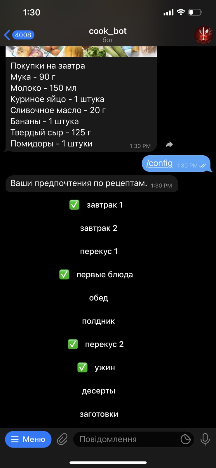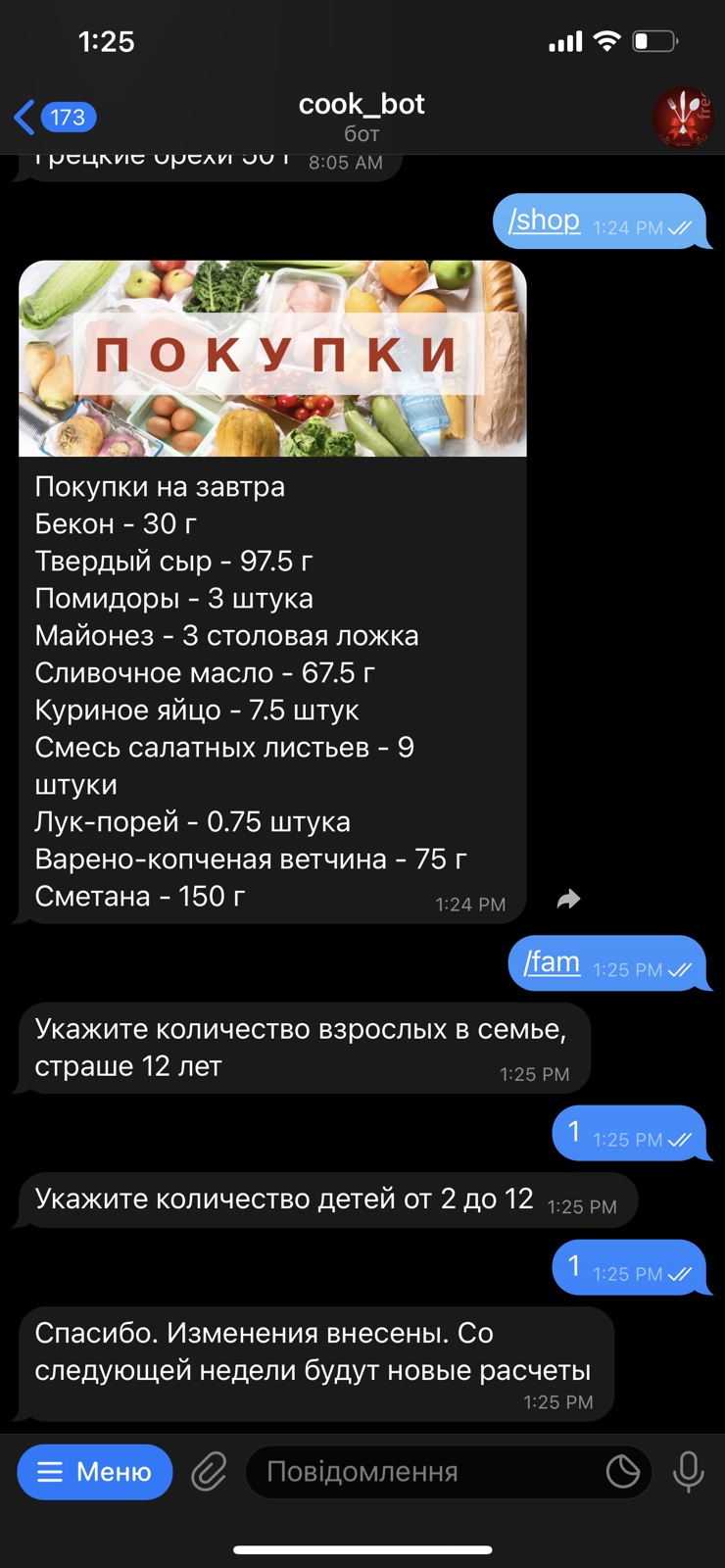 Далі раз на тиждень, по п'ятницях, бот вам надсилає ваше меню наступного тижня. Враховуючи всі ваші побажання. У той же день ви отримуєте список продуктів для приготування всього запланованого.